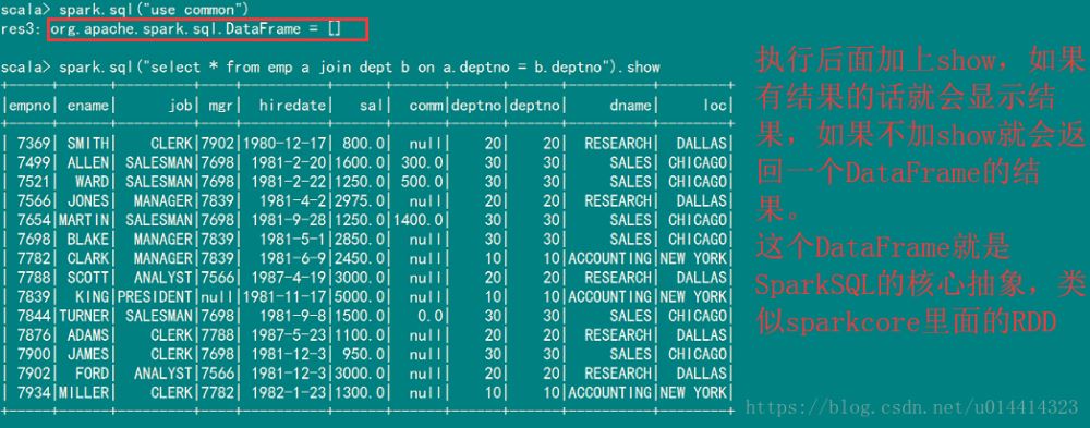 scala> spark.sql("select * from emp a join dept b on a.deptno = b.deptno").show