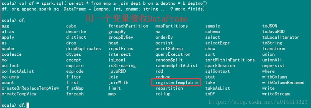 scala> df.registerTempTable("tmp04") //通过DataFrame注册一个临时表
