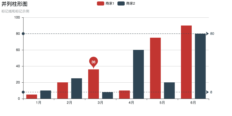 bar2.add('商家2', x_attr, data2, mark_line=['min', 'max']) # 标记线:商家2的最小/大值
