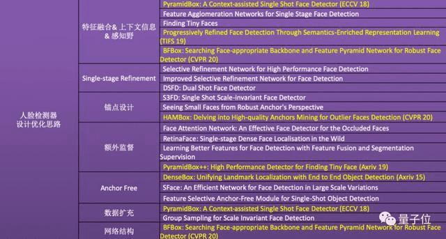 上图便是人脸检测器设计的几个优化思路,包括特征融合、上下文信息、锚点设计、额外监督、数据扩充、网络结构等。黄色标注部分为百度视觉发表的论文。