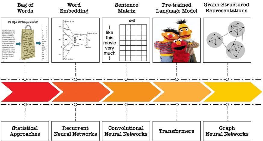 自然语言处理(NLP)旨在读取和理解未结构化的自然语言文本来完成不同的任务。「如何表示文本」以及「如何进行计算」是其中的两个核心问题。早期的 NLP 研究中,利用 bag-of-words 模型表示文本,通过统计不同单词的频次来形成文本的向量表示,同时结合统计方法进行文本处理,这丢失了文本的词序信息以及单词之间的联系,本质上是用 one hot encoding 来表示每个单词;在深度学习中,研究者根据单词的共现来学习词向量,每个单词由一个 dense vector 表示,语意相似或联系紧密的词在向量空间中距离更小,再结合 RNN 模型(LSTM,GRU 等)进行文本编码完成各种任务;其后又有研究工作将文本类比图像,编码形成矩阵表示,结合 CNN 类模型进行计算;近年来,预训练语言模型,利用自监督学习训练各类大型语言模型,从而给单词或文本赋予上下文敏感的(context-sensitive),多层的语义向量表示,其采用的模型是多层的 Transformer。