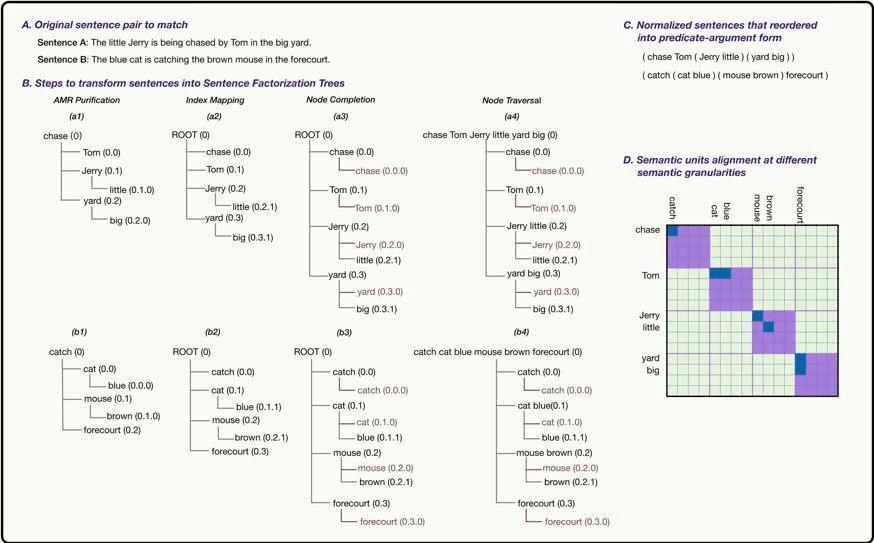 对于短文本匹配,论文提出了层次化句子分解(Hierarchical Sentence Factorization)来将句子分解为多层的表达,每一层都包含完整的所有单词,并且语句重排列为「predicate-argument」的顺序。随着层数的增加,一个句子逐渐被分解为更加细粒度的语义单元。因此,利用这种多层次,重排序的句子表示,我们可以对齐两个句子,并结合不同的语义粒度去比较他们的语义距离。