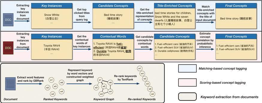 ConcepT 系统还可以用于给文章打上概念标签。主要包含两种策略:基于匹配的标记算法和基于概率推断的标记算法。