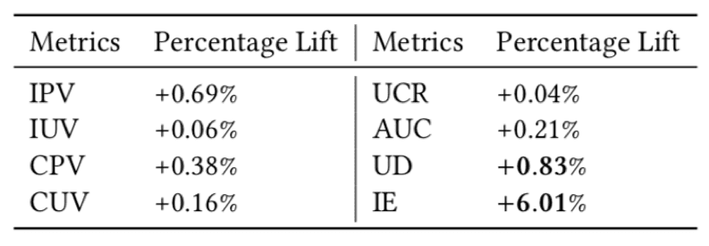 图 13. 在线 A/B test 结果。ConcepT 系统对 QQ 浏览器信息流业务各项指标有明显提升。其中最重要的指标曝光效率(IE)相对提升了 6.01%。