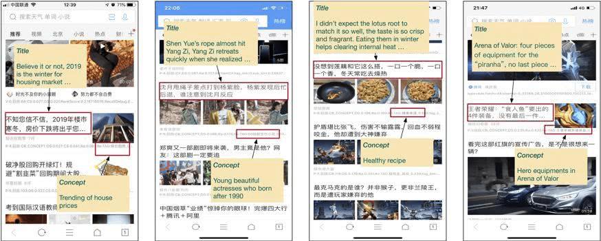 图 14. ConcepT 系统对文章打上概念标签。目前每天可处理 96700 篇文章,其中约 35% 可以打上概念标签。我们创建了一个包含 11547 篇文章的概念标记数据用以评测标记的准确率。人工评测发现,目前系统的标记准确度达 96%。