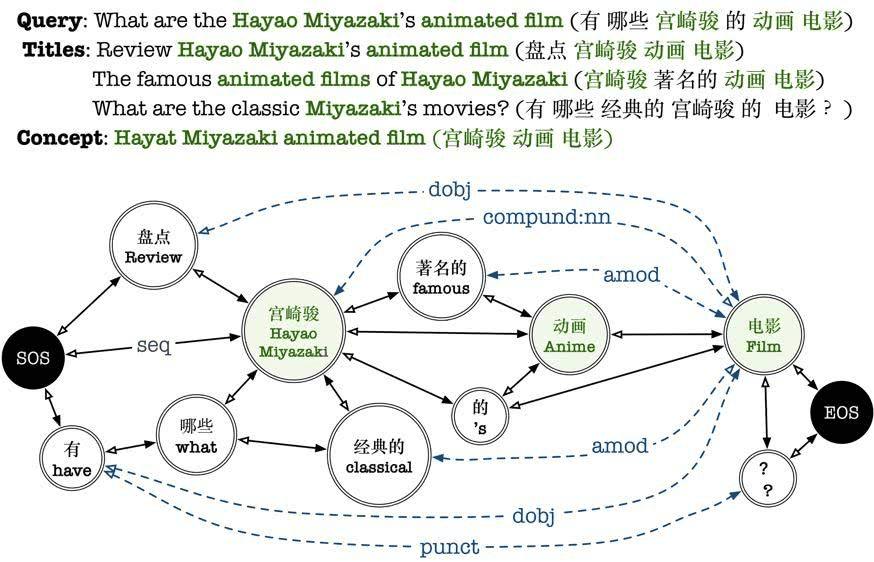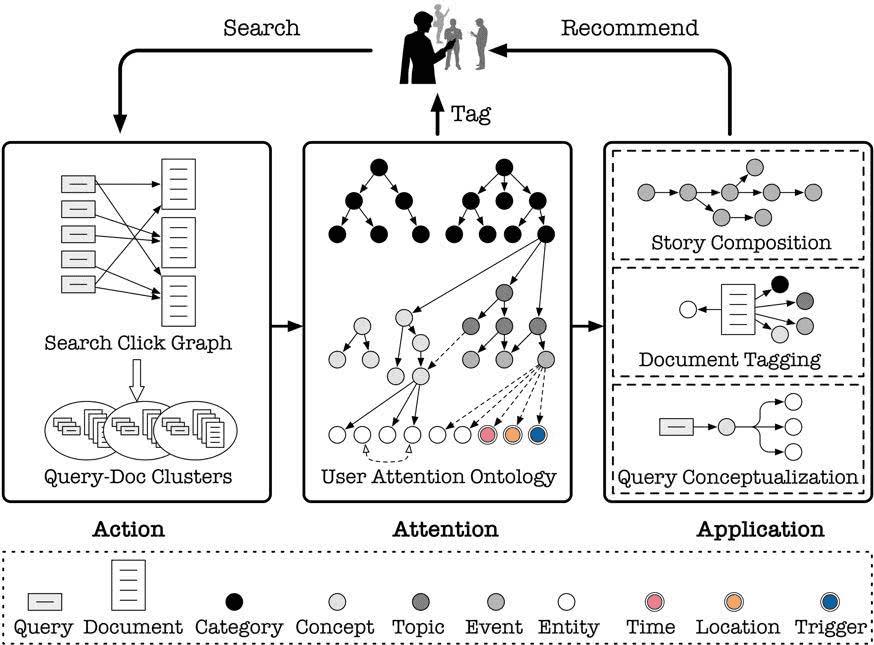 过去的研究工作,包括 DBPedia, YAGO, Probase 等等知识图谱或者概念库,从维基百科或者网页文章中提取各种不同的概念。但是这样提取的概念和用户的认知视角并不一致。例如,与其认识到丰田 4Runner 是一款丰田 SUV 或者说是一种汽车,我们更感兴趣是否能把它概念化为「底盘高的汽车」或者「越野型汽车」。类似地,如果一篇文章在讨论《简爱》,《呼啸山庄》,《了不起的盖斯比》等电影,如果我们能认识到它在讨论「小说改编的电影」这个概念,那么会帮助极大。然而,目前的知识图谱等工作目的是建立一个关于这个世界的结构化知识表示,概念提取自语法严谨的文章。因此,它们不能从用户的视角去对文本(例如 query 和 document)进行概念化,从而理解用户的意图。另一方面,目前的工作也主要在于提取长期稳定的概念,难以提取短时间出现的热门概念以(例如「贺岁大片」,「2019 七月新番」)及它们之间的联系。