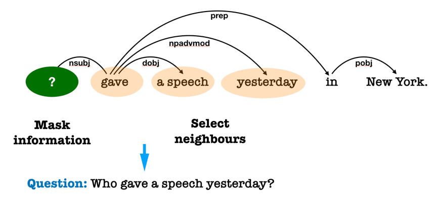 问题生成的过程可以从语法树的角度去观察:选择答案片段就像是从语法树中覆盖了一部分信息,而选择线索片段(clue)的过程就是在覆盖的信息附近,选择一部分节点作为提示输出到问题中。
