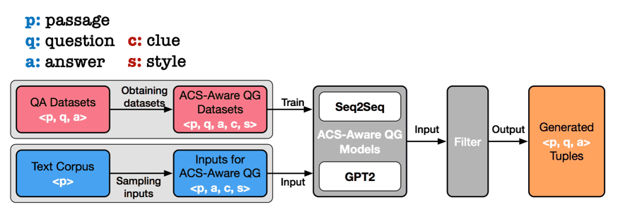 本文提出的 ACS-QG 系统,可以从无标注的句子中,生成高质量的问答对数据。它由以下模块组成:数据集创建模块,可以从目前已有的问答数据集(例如 SQuAD)中,创建 ACS-QG 任务的训练数据集;输入选择模块,可以从无标注的句子中,合理的选择和创建(answer, clue, style)三元组作为问题生成的输入;问题生成模块,可以利用输入三元组生成问题,这个模块的训练数据来自于第一个数据集创建模块;质量控制模块,用于过滤低质量的问答对。