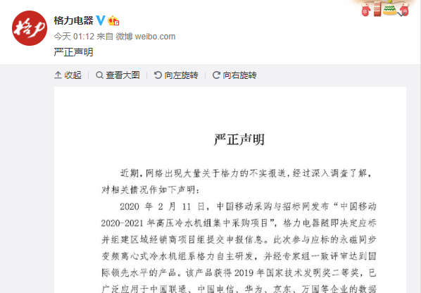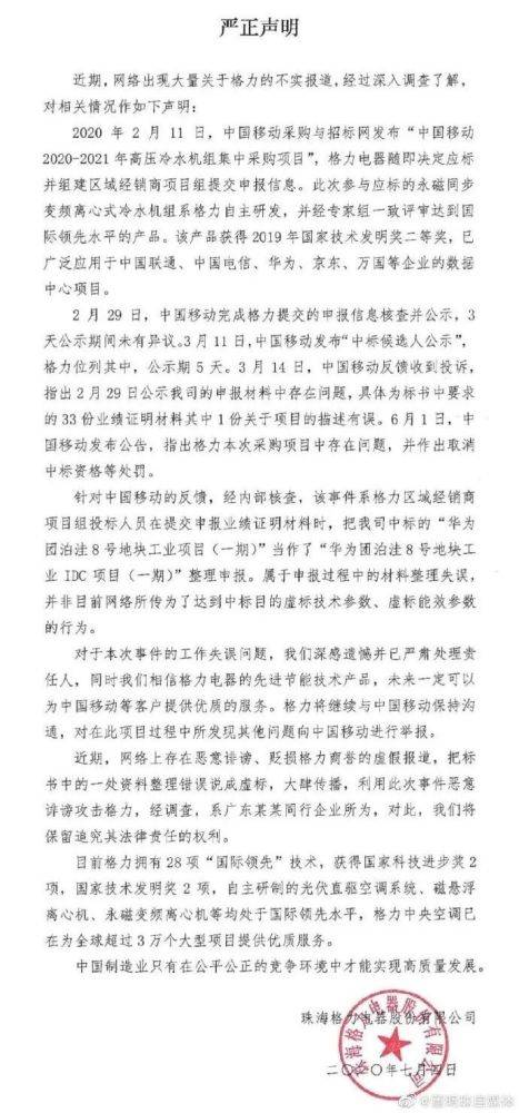 声明称,针对中国移动的反馈,经内部核查,该事件系格力区域经销商项目组投标人员在提交申报业绩证明材料时,把公司中标的“华为团泊洼8号地块工业项目(一期)”当作了“华为团泊洼8号地块工业IDC项目(一期)”整理申报。属于申报过程中的材料整理失误,并非目前网络所传为了达到中标目的虚标技术参数、虚标能效参数的行为。