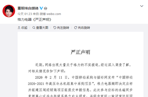 7月4日凌晨1点多,格力电器官方微博和董明珠自媒体微博双双发表了《严正声明》,回应中国移动所指“弄虚造假”一事。