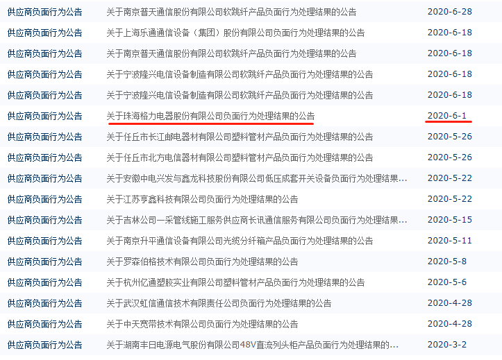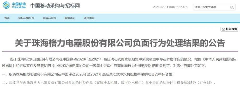 上述公告指出:“鉴于珠海格力电器股份有限公司在中国移动2020年至2021年高压离心式冷水机组集中采购项目中存在弄虚作假的情况,根据《中华人民共和国招标投标法》和采购文件及其载明的《中国移动通信集团一级集中采购商负面行为处理规则》的相关规定,取消珠海格力电器股份有限公司在中国移动2020年至2021年高压离心式冷水机组集中采购项目的中标资格;后续三年内珠海格力电器股份有限公司参加的同品类产品(高压冷水机组、低压冷水机组)集中采购的综合评审得分扣减5分(百分制)。”