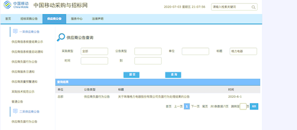 第一财经在中国移动采购与招标网上看到《关于珠海格力电器股份有限公司负面行为处理结果的公告》于6月1日发布,时隔一个月突然大面积发酵令不少人感到意外。记者询问中国移动“弄虚造假”具体指什么,官方并未透露,只表示以公告为准。