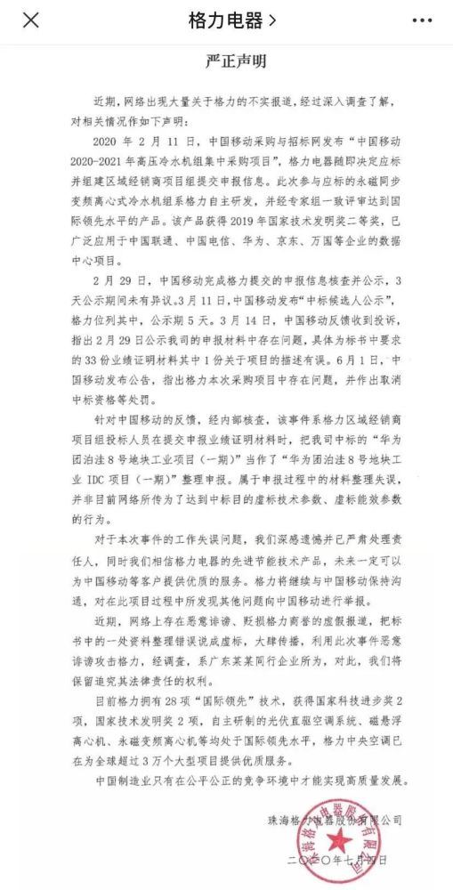 据格力电器的声明,2020年2月11日,中国移动采购与招标网发布“中国移动2020-2021年高压冷水机组集中采购项目”,格力电器随即决定应标并组建区域经销商项目组提交申报信息。此次参与应标的永磁同步变频离心式冷水机组系格力自主研发,并经专家组一致评审达到国际领先水平的产品。该产品获得2019年国家技术发明奖二等奖,已广泛应用于中国联通、中国电信、华为、京东、万国等企业的数据中心项目。