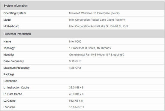 该芯片有8个核心和16个线程,基本时钟速度为3.2 GHz,最高记录时钟为4.3 GHz(工程样本)。OIntersting是每个核心512 KB的L2高速缓存,与Sunny Cove架构相同。用户会看到存在32个执行单元,这是Gen 12 IGP,预计将基于Intel的Xe图形体系结构。在openCL基准测试期间,它的最大运行频率为1,150 MHz。获得了约6,200点的分数,这使Rocket Lake芯片略低于Nvidia的GeForce 940MX(约6,500点)和AMD的集成Vega 6(约6,900)。