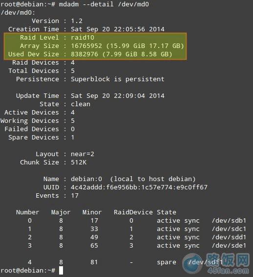 该阵列构建完毕后(构建过程应该用不了几分钟),# mdadm --detail /dev/md0的输出应该是这样: