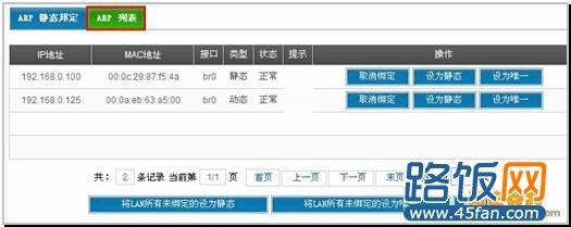 ARP列表菜单将显示当前路由的ARP表记录,您可以在此界面一键绑定所有未绑定的MAC地址(已绑定的IP跟MAC将不受影响),或者对单独的IP跟MAC做绑定操作。