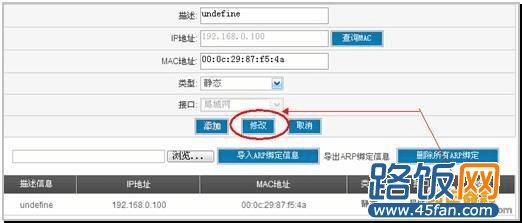 要修改列表中添加的IP与MAC绑定,只需要在相对应的条目上点击右边的修改图标,然后在上方规则框中修改即可,如图所示: