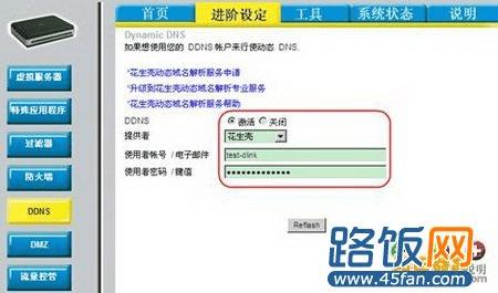 路由器“进阶设定”→“DDNS”, 填入所申请到的花生壳的帐号和密码。点击“执行”。