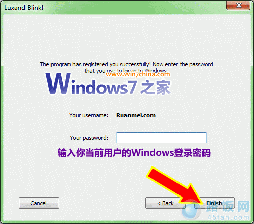 上图,输入当前用户登录Windows的密码,点击Finish按钮结束即可。