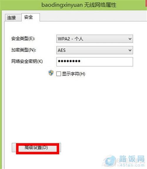4.在无线属性界面选择安全,然后点击高级设置。