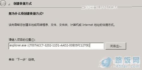 在Windwos 7系统桌面上,右击鼠标,在弹出的菜单中选择“新建→快捷方式”,在弹出的对话框中输入“explorer.exe ::”(不要输入双引号,如下图)。