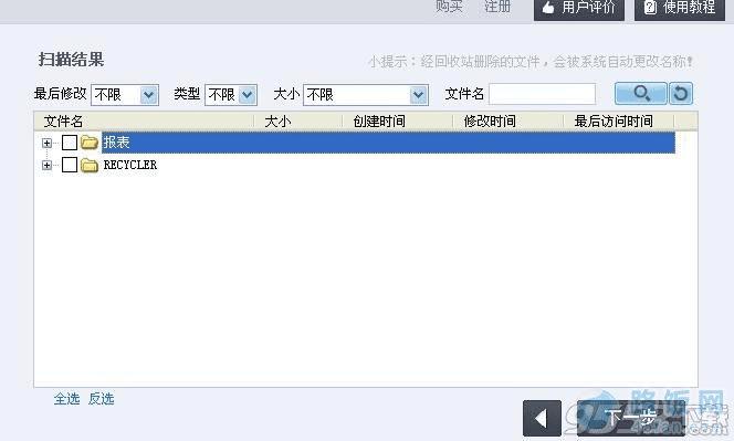 点击“下一步”后,程序开始扫描该分区,最后弹出一个文件列表窗口。该窗口与“资源管理器”差不多,用户只需在该列表中查找需要恢复的文件并打上“√”即可。