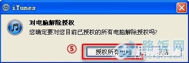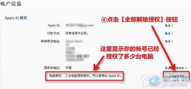 第三步.如下图,此时iTunes会出现帐户信息界面,在电脑授权那里你可以看到你的帐号已经授权了多少台电脑,如果你五台授权都用完了,那么界面则是显示“5台电脑得到授权,可以使用此Apple ID帐号”。然后点击【全部解除授权】按钮。