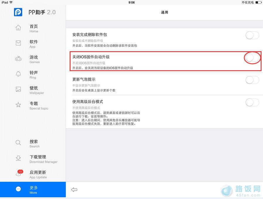 购买苹果产品的朋友一般都是冲着拍照技术和独有的系统去的,但多数果粉在iphone或者ipad越狱后想直接在设备上进行系统升级都会遇到一直显示正在检查更新界面不动,这是因为越狱后自动屏蔽更新了,如果装了pp助手先在pp助手设置里面将关闭ios固件自动升级选项关闭再去试一下。