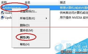3、在右边的细节窗口中,右击“Administrator”,选择“属性”。