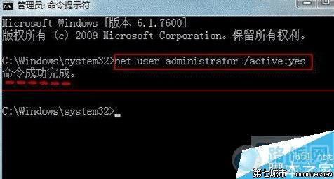 2、命令窗口打开后,键入net user administrator /active:yes。输完后按一下回车键。看到“命令成功完成”信息即表明系统管理员 Administrator 账户已启用图。
