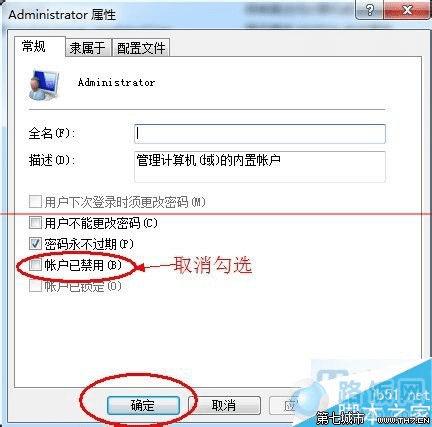 4、默认状态下,Administrator属性窗口中“账户已禁用”项是勾选着的。我们需要取消其勾选,然后按“确定”保存更改