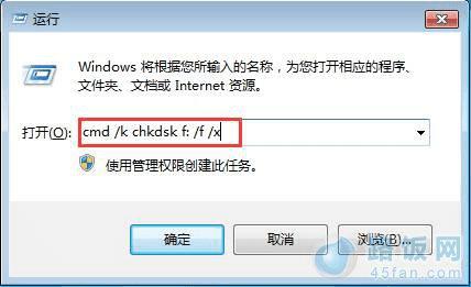 在桌面上打开运行窗口(win+r键),输入cmd /k chkdsk f: /f /x,其中f为出现问题的盘符,按回车键确定,如图所示: