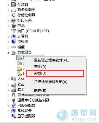 然后返回桌面,打开设备管理器,将无法识别的USB设备卸载,然后再重启电脑,重新连接上设备,重新安装设备驱动,这样就能够解决了,如图所示: