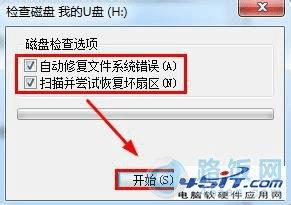 3、然后勾选“自动修复文件系统错误”和“扫描并尝试恢复坏扇区”两项,点击“开始”按钮,进行U盘修复。