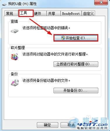 2、在弹出的U盘属性窗口中,选择“工具”标签,再点击“开始检查”按钮。
