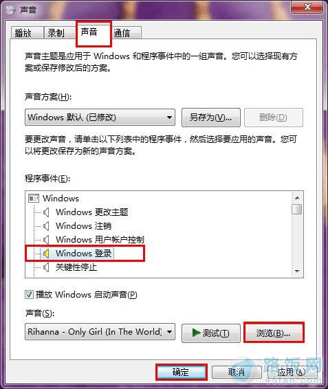 4.在打开的声音窗口,点击切换到“声音”项,点击程序时间下的“Window登录”再点击“浏览(B)…”选择刚存放在文件夹中的音乐文件,点击“确定”完成操作。如下图所示