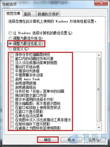 4.弹出性能选项后,我们就可以看到“视觉效果”标签下,系统的外观特效选项了,取消所有视觉特效的勾选,完成后点击“确定”按钮保存退出。如下图所示