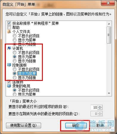 3.接着在弹出的窗口中我们通过下拉菜单找到“计算机”和“控制面板”,将其设置为“显示为菜单”然后点击“确定”按钮即可;如下图所示:
