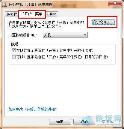 2.在打开的“任务栏和开始菜单属性”窗口中,我们将界面切换至“开始菜单”栏目,然后点击右边的“自定义”按钮;如下图所示: