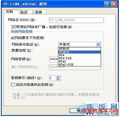 (2)无线网络配置界面添加配置文件,“关联”选项卡中“网络身份验证”选择“共享式”即可解决,如下图所示: