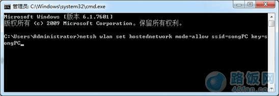 第二步:在命令行中输入:netsh wlan set hostednetwork mode=allow ssid=songPC key=songPC(ssid的后面是用户名,key后面是密码,随便你们怎么设置,自己记住就好。mode:是否启用虚拟WiFi网卡,改为disallow则为禁用)