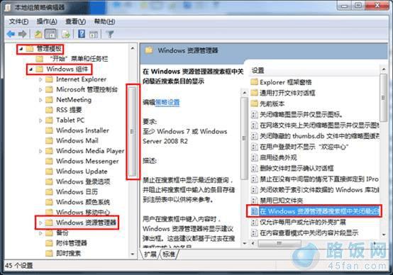2.打开本地组策略编辑器后,在右边栏中中,依次进入“用户配置” — “管理模块” — “windows组件” — “windows资源管理器”(注意下拉滚动条),在左边栏中中,双击“在windows资源管理器搜索框中关闭最近搜索条目的显示”