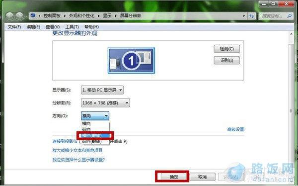 第二步、 在“屏幕分辨率”窗口中,选定“方向”标签,选择“横向(翻转)”。当然,你也可以根据你的习惯,调整方向。然后,你再点击“应用”最后“确定”,就可以了。