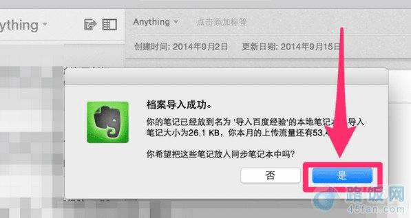 3、此时会提示笔记已经导入成功,并会询问是否加入新的笔记本,一般选择“是”就可以了,然后再去新笔记本找到导入的笔记来转移至其他笔记本。