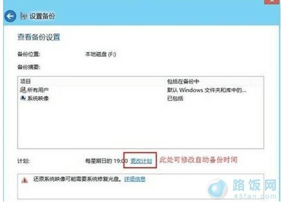 这时候操作者可以看到计划备份时间,点击窗口最下面的更改计划,设定完成之后点击保存设置并运行备份。