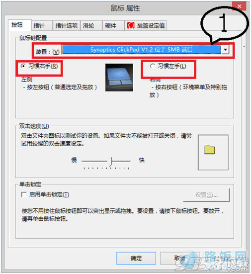 4、这里就是设置版面了,这里小编为了大家理解,设置里大大的“1”,因为小编家里只有笔记本,就示例笔记本了,台式机应该是差不多的【嘻嘻,不要打小编啊】,言归正传,这里除了“1”之外的便是笔记本上的触摸鼠标的左右手设置,大家选择就好了,要设置鼠标左右手的【即左右敲击功能互换】,选择“1”,敲击~