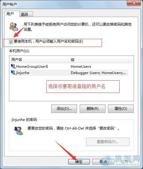 如下图所示,打开用户账户对话框后,将“要使用本机,用户必须输入用户名和密码”前面的勾去掉,最后点击“确定”按钮保存设置。