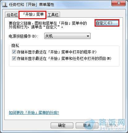 2、在弹出的属性设置窗口中,点击切换到“开始菜单”,然后点击“自定义”按钮,如下图所示: