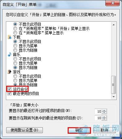 3、打开自定义开始菜单窗口后,在下拉框中找到并勾选“运行命令”选项,点击“确定”按钮保存修改即可,如下图所示: