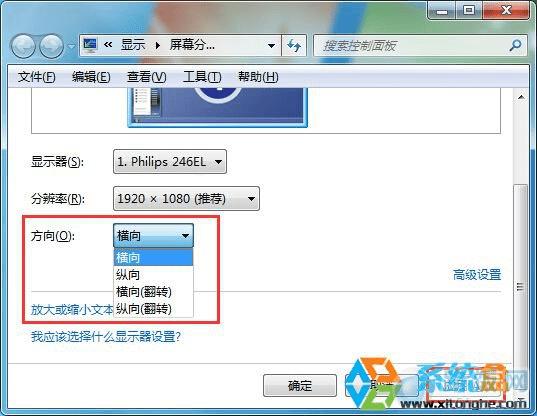 2、到达更改分辨率界面后,我们可以看到在“方向”选项处,有“横向”、“纵向”、“横向翻转”、“纵向翻转”,四个选项,横向为我们屏幕显示的默认模式,具体效果大家可以试试,选择后应用就可以了,如果感觉不对的话可以按R键还原。
